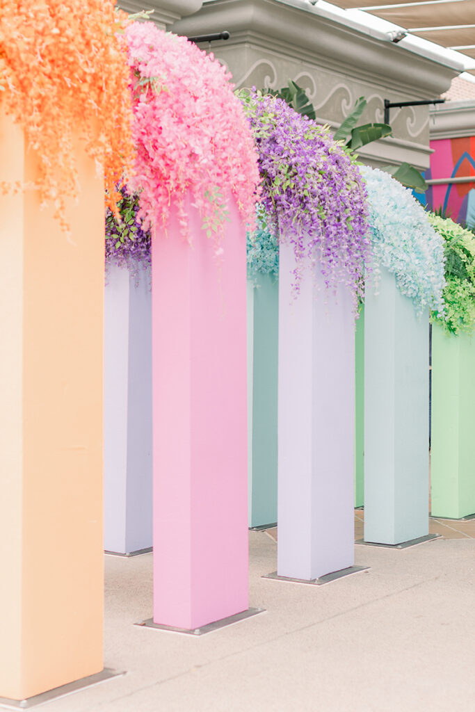 Close-up of cascading pastel flowers hanging from colorful pillars at Belmont in Bloom floral installation in Belmont Park, San Diego